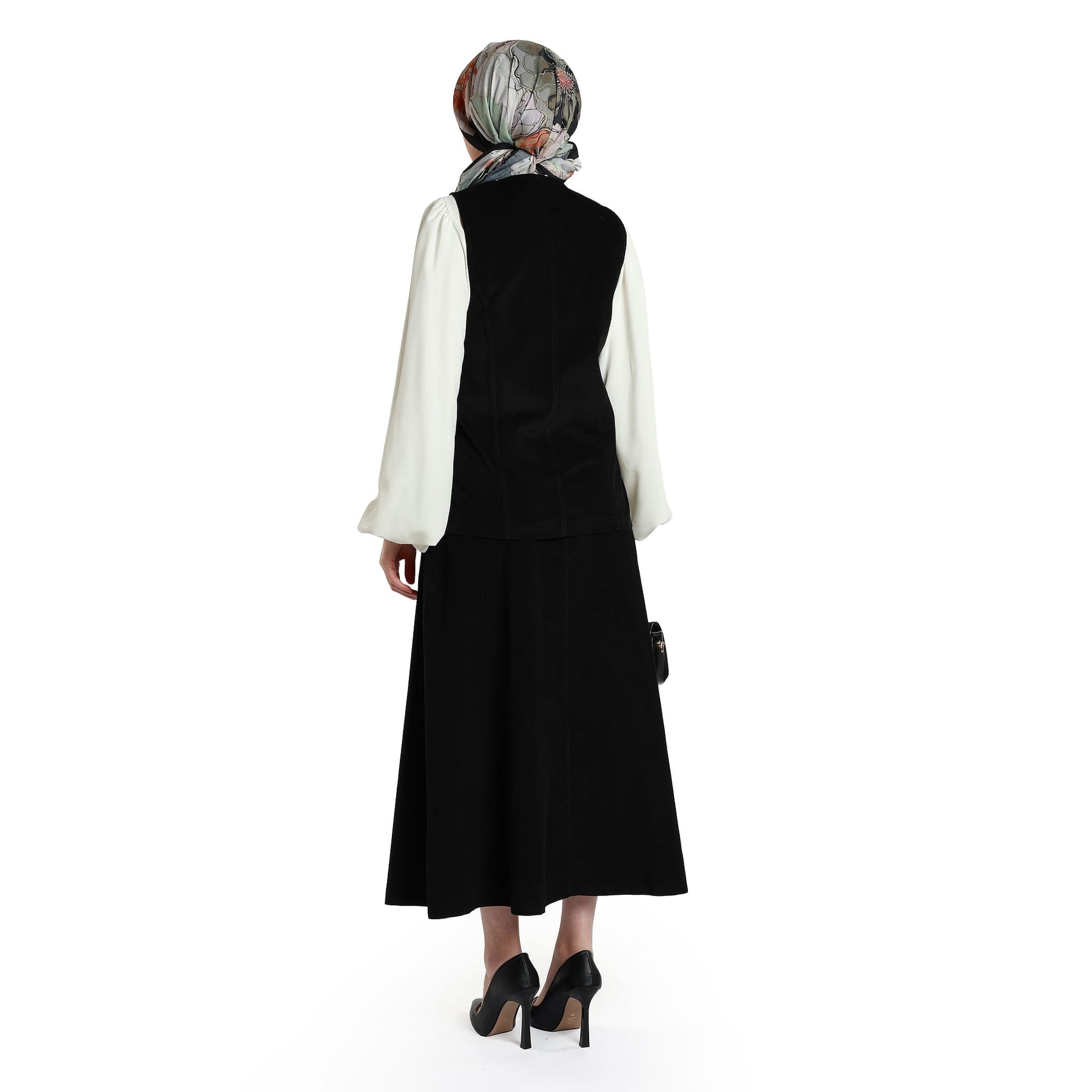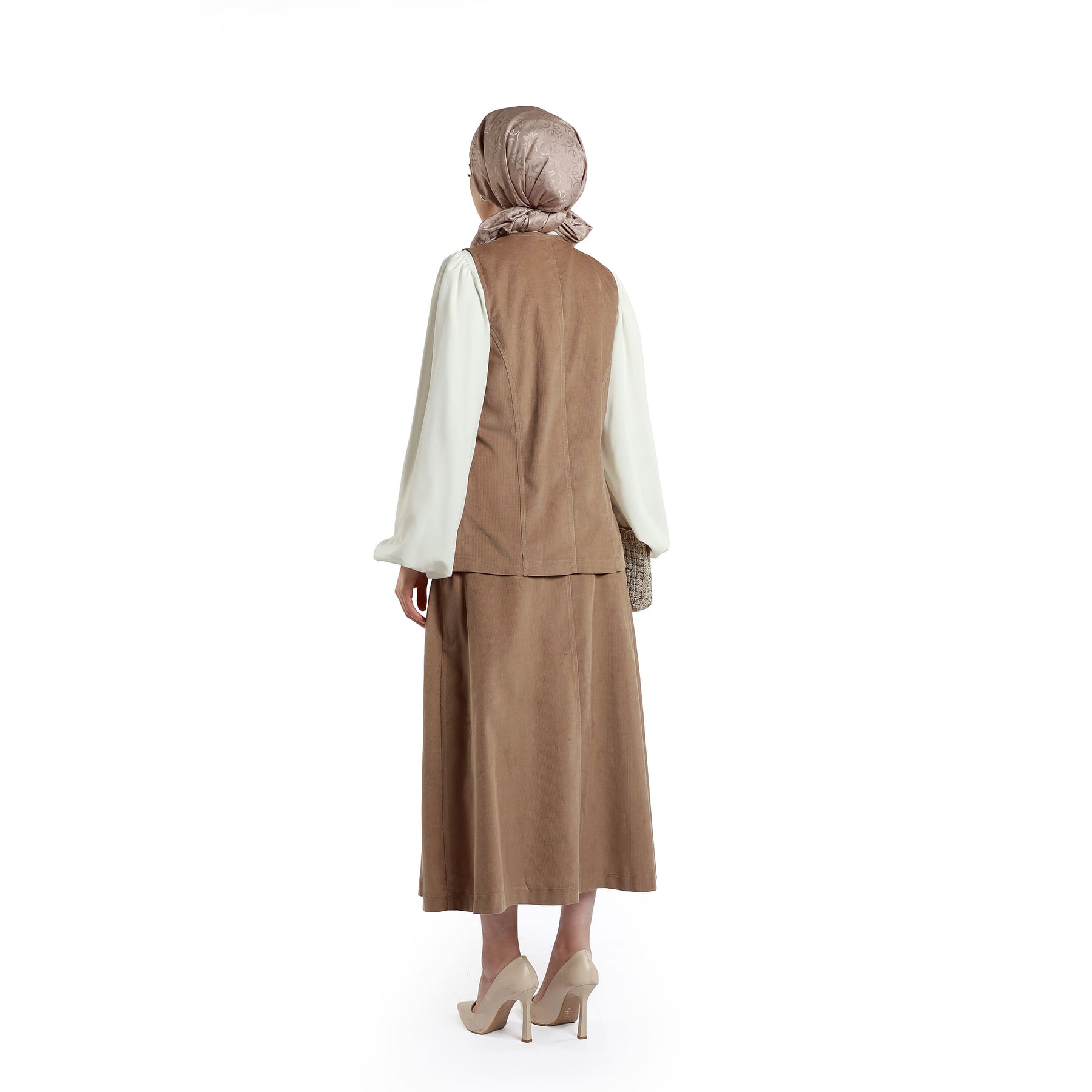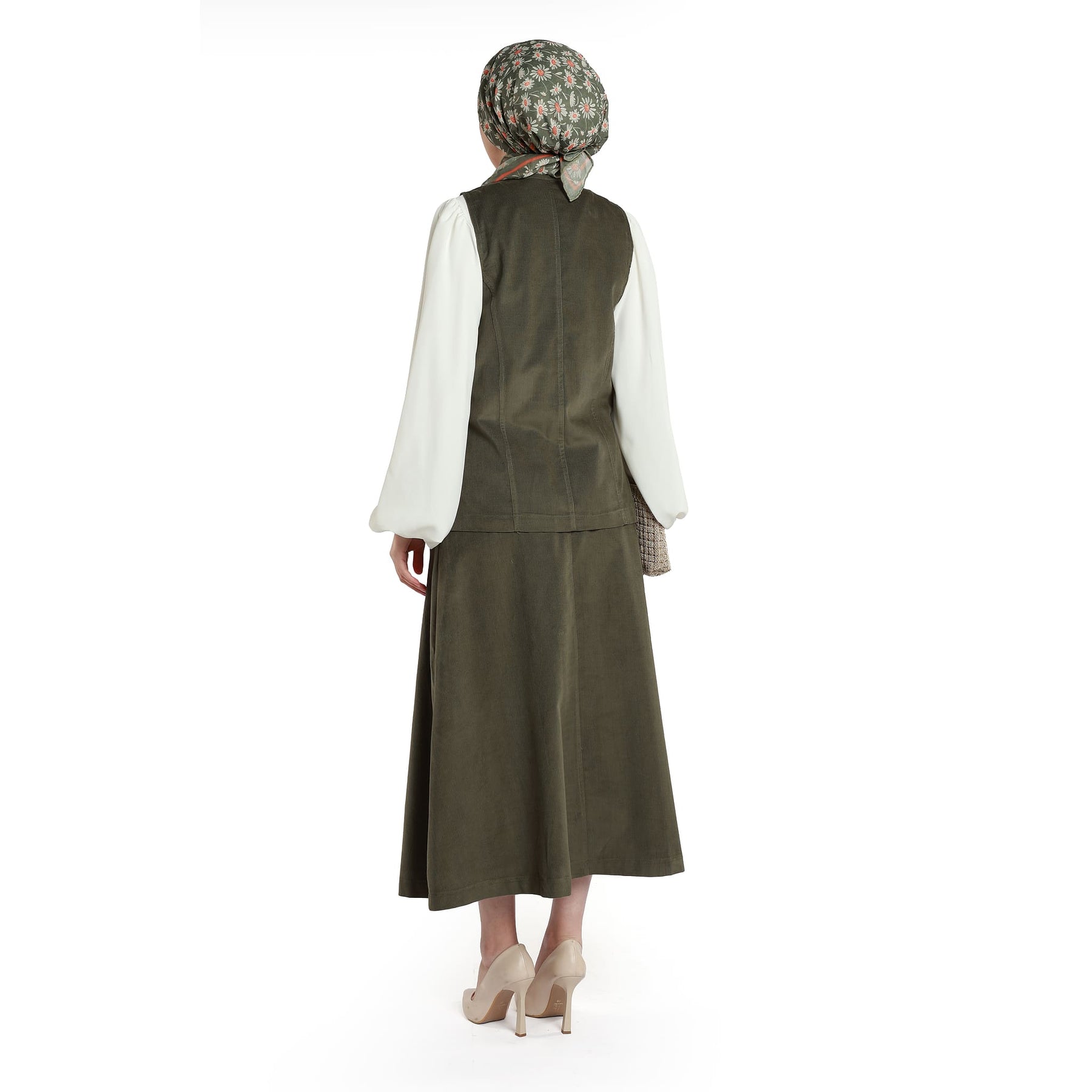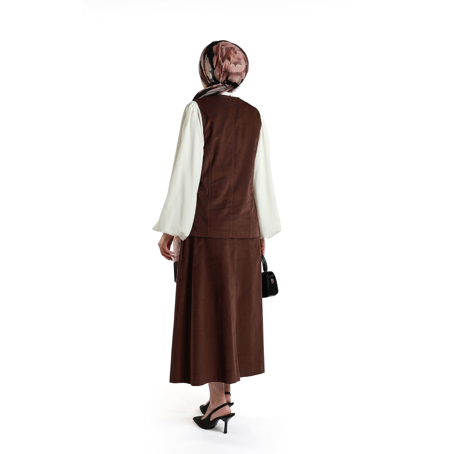 This velvet vest and skirt set offers an elegant yet comfortable look for both everyday wear and special occasions. Made from 100% cotton, it feels soft on the skin. Available in black, beige, brown and green, it styles easily with different blouses and accessories. The buttoned vest features decorative pocket flaps for a refined finish.