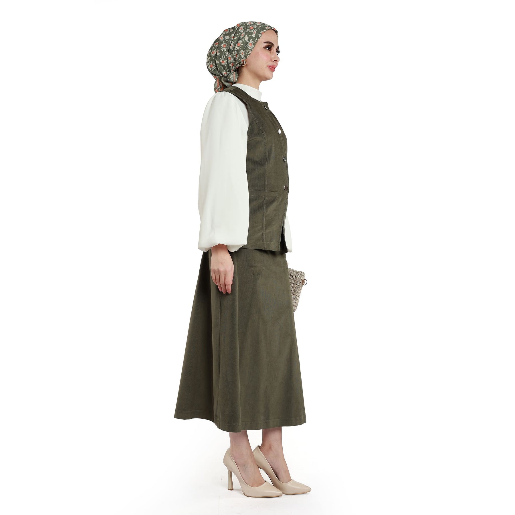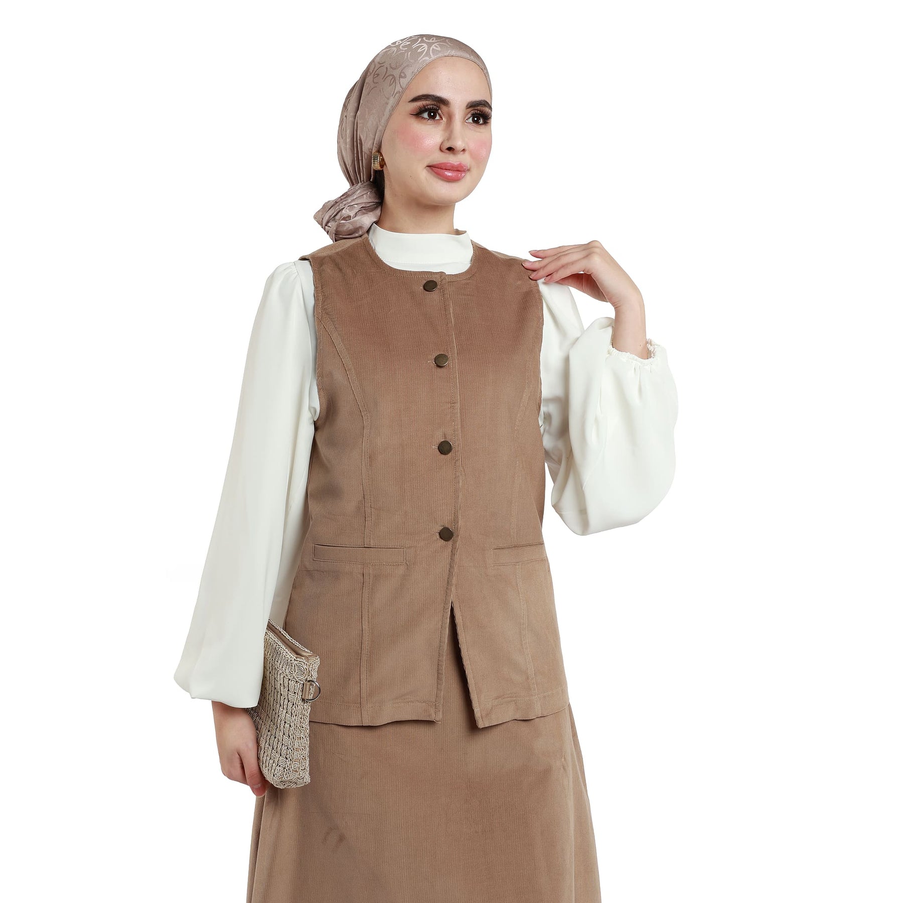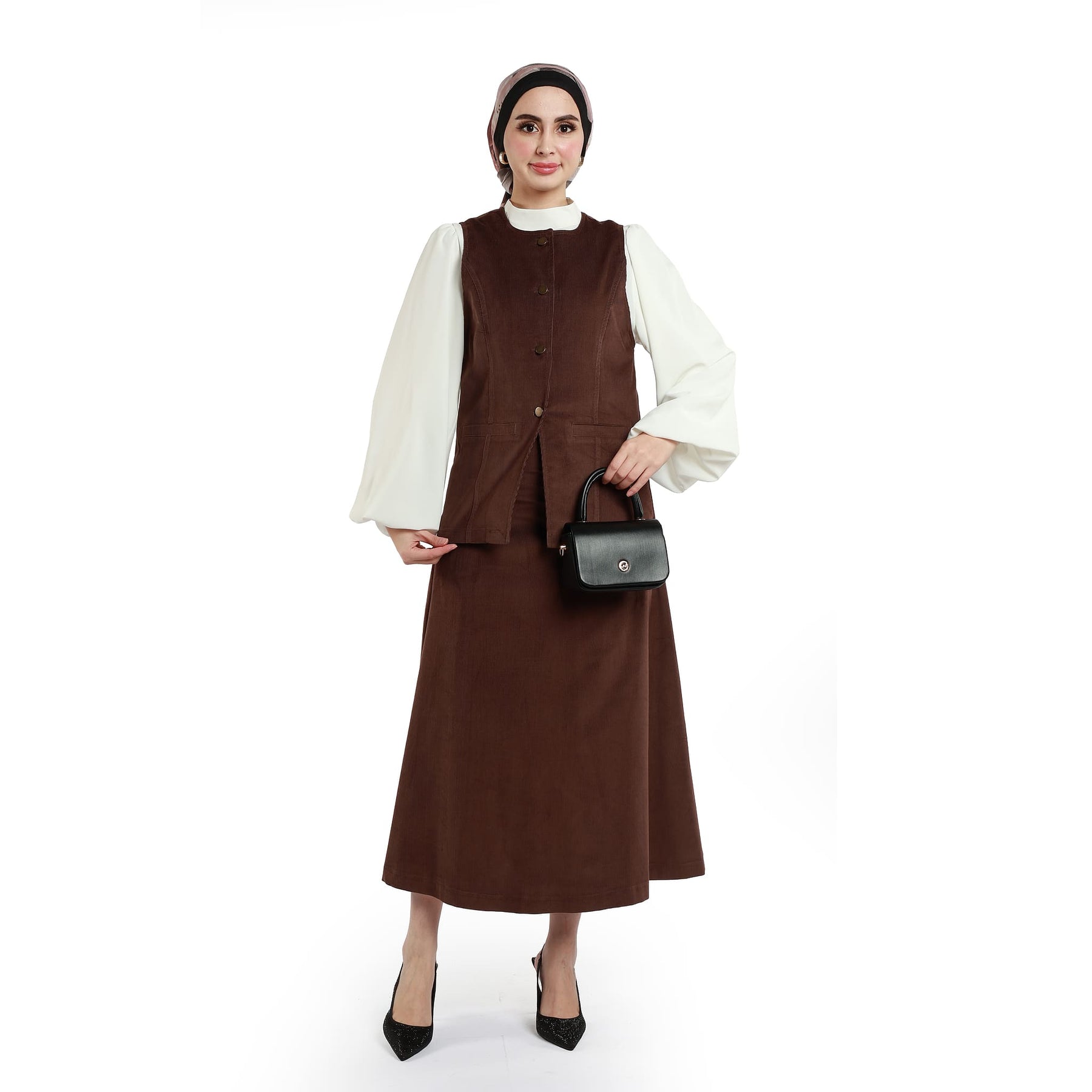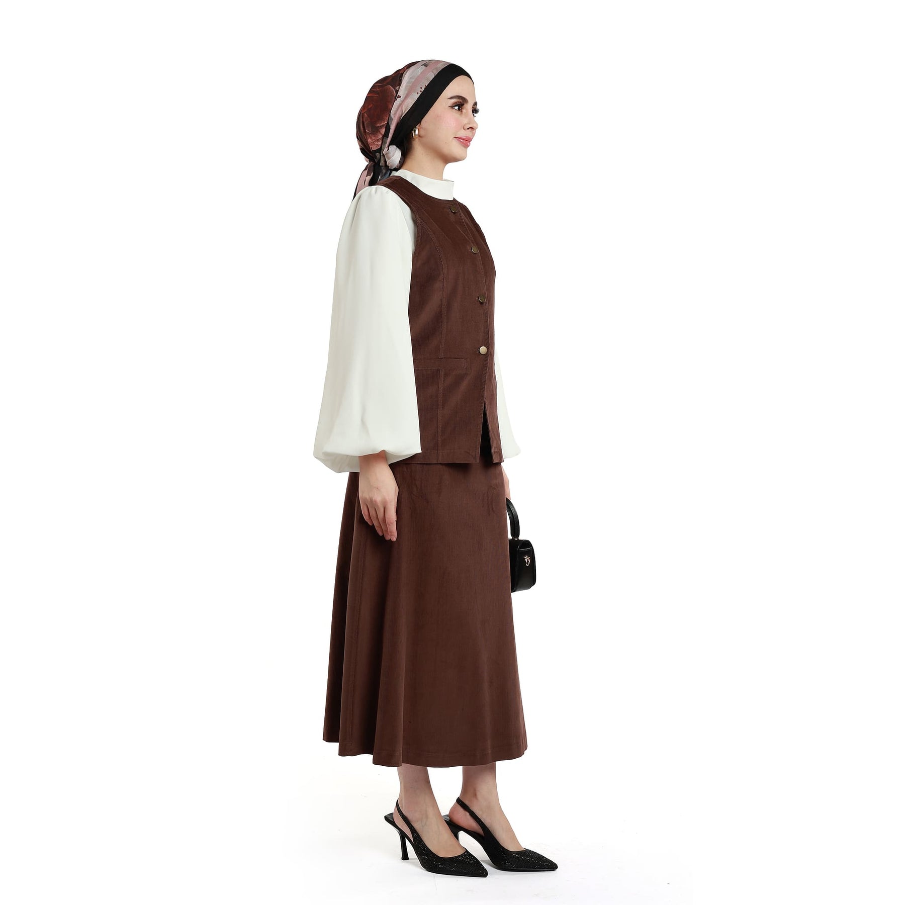 This velvet vest and skirt set offers an elegant yet comfortable look for both everyday wear and special occasions. Made from 100% cotton, it feels soft on the skin. Available in black, beige, brown and green, it styles easily with different blouses and accessories. The buttoned vest features decorative pocket flaps for a refined finish.