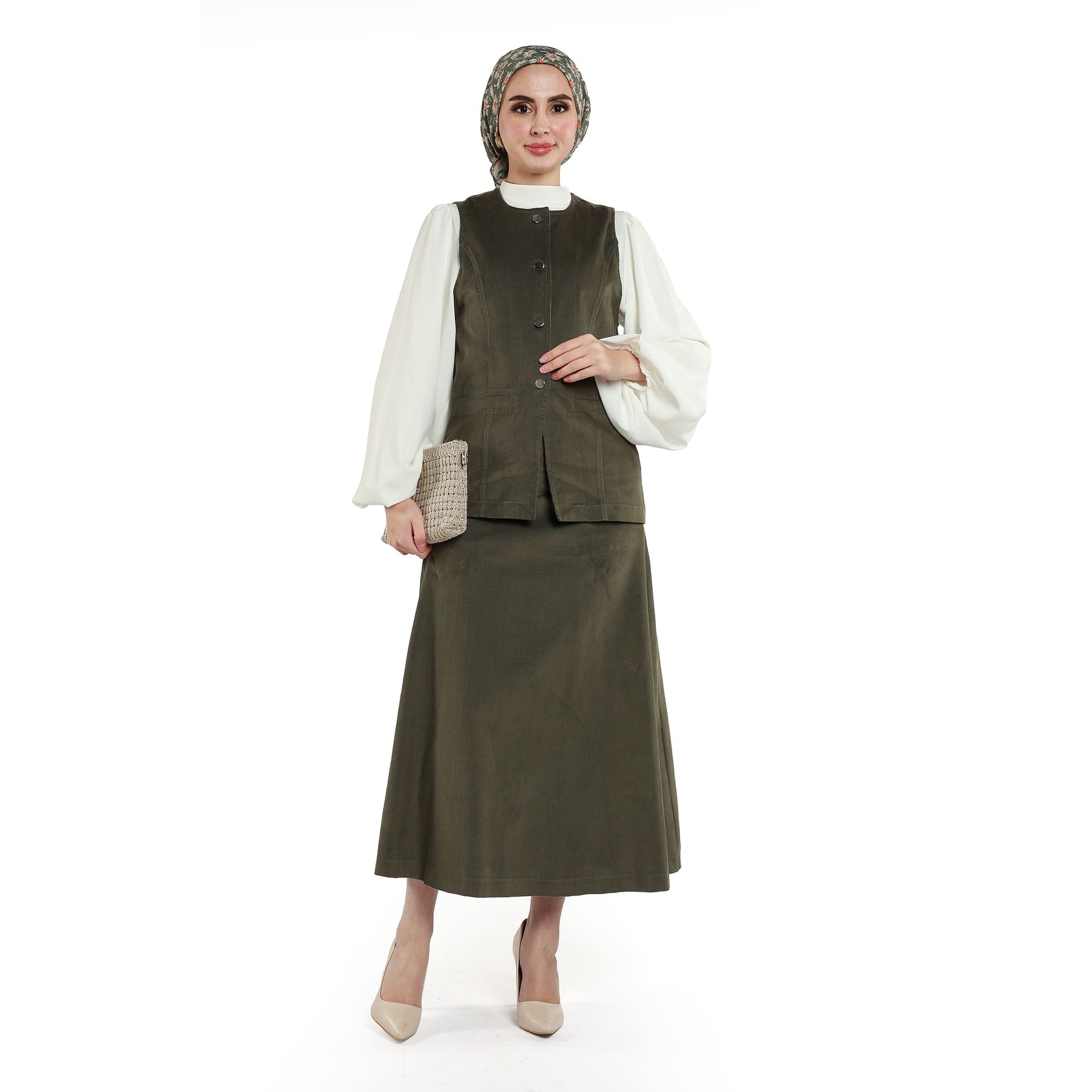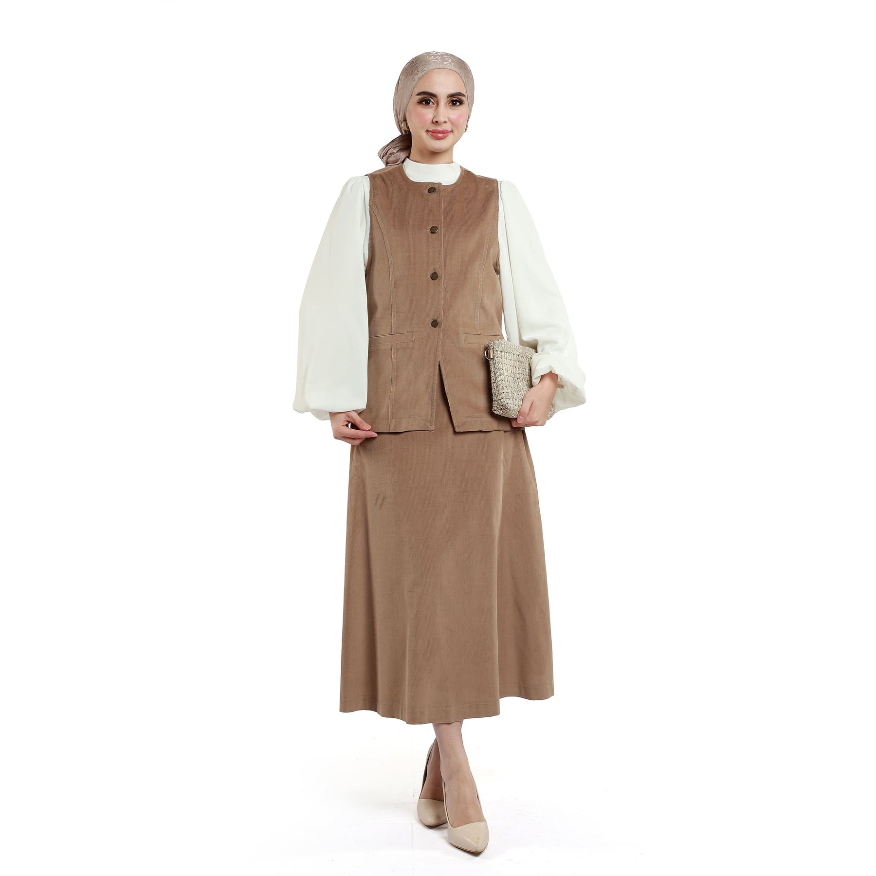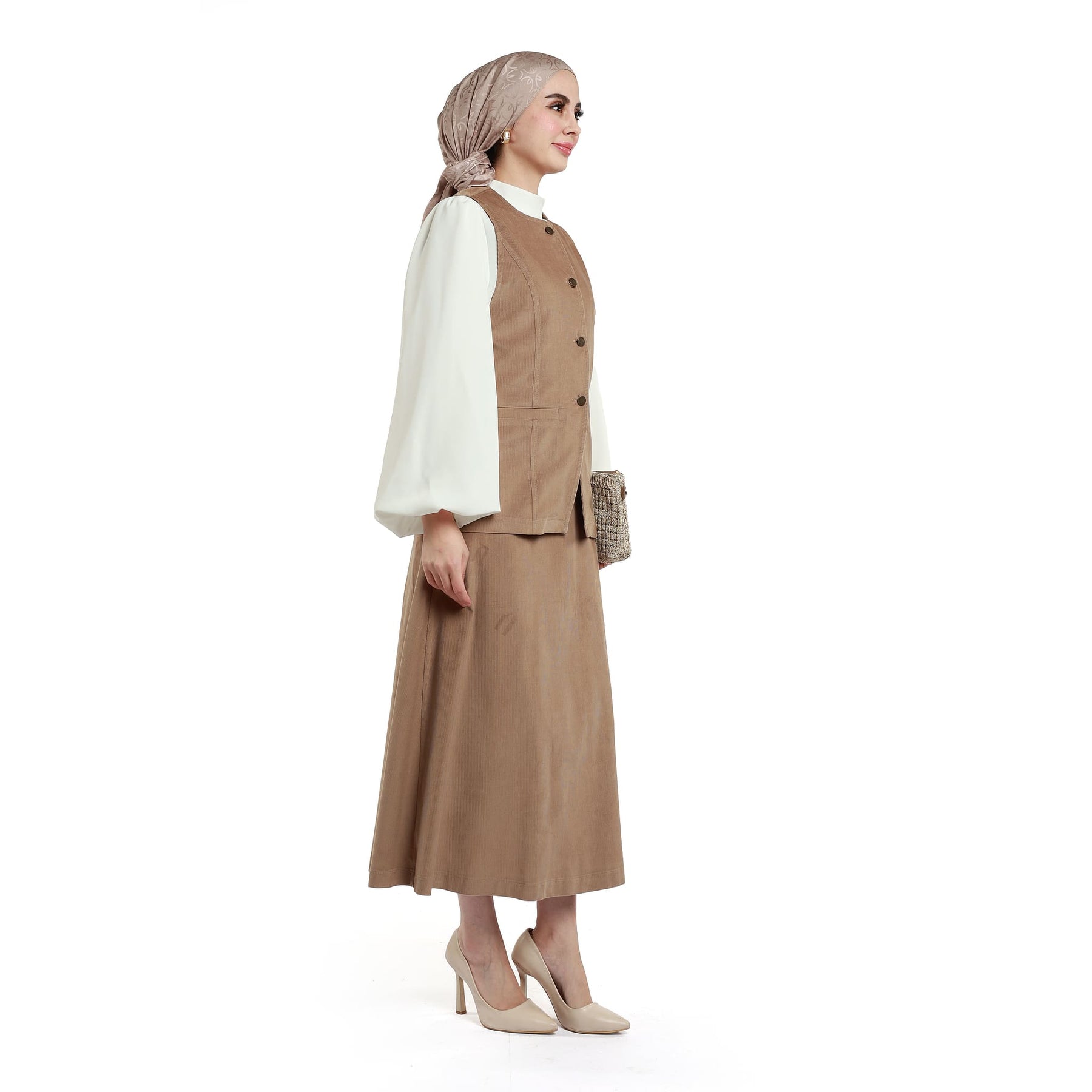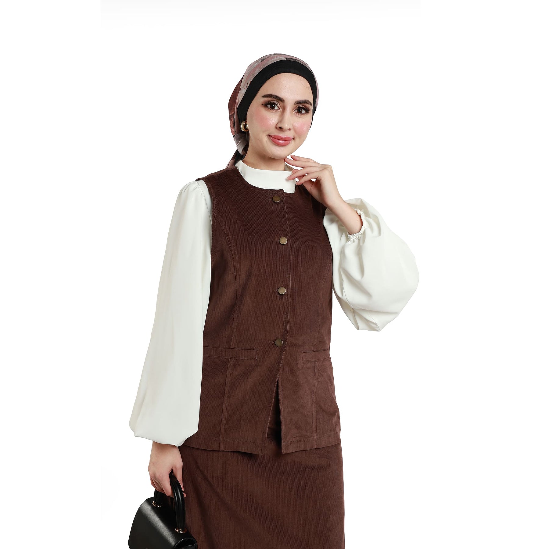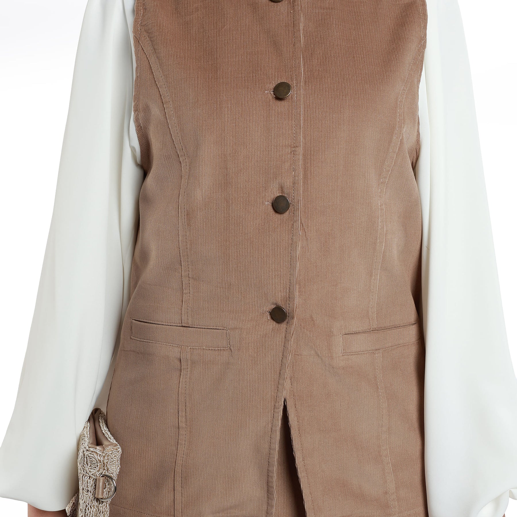 This velvet vest and skirt set offers an elegant yet comfortable look for both everyday wear and special occasions. Made from 100% cotton, it feels soft on the skin. Available in black, beige, brown and green, it styles easily with different blouses and accessories. The buttoned vest features decorative pocket flaps for a refined finish.