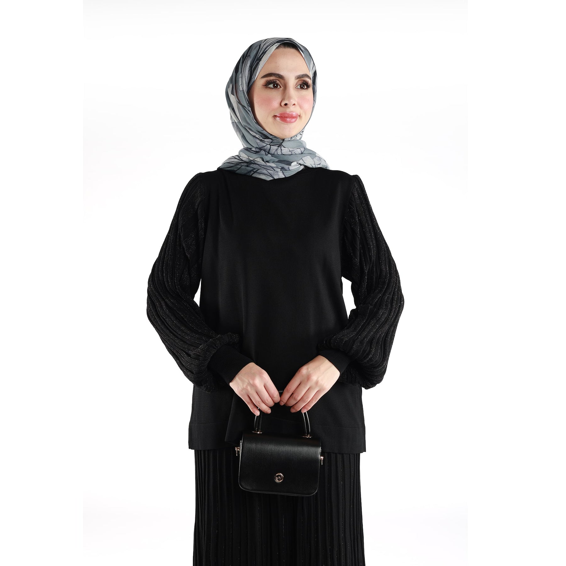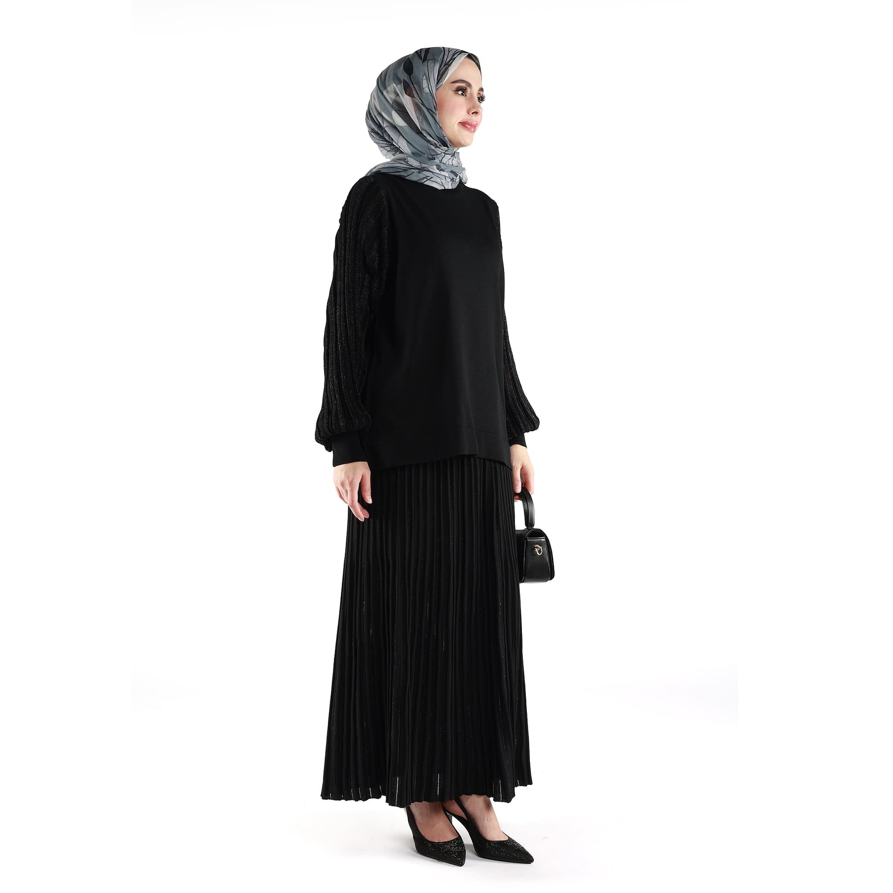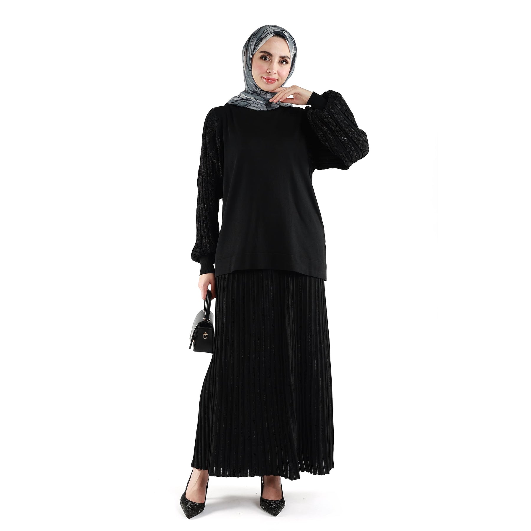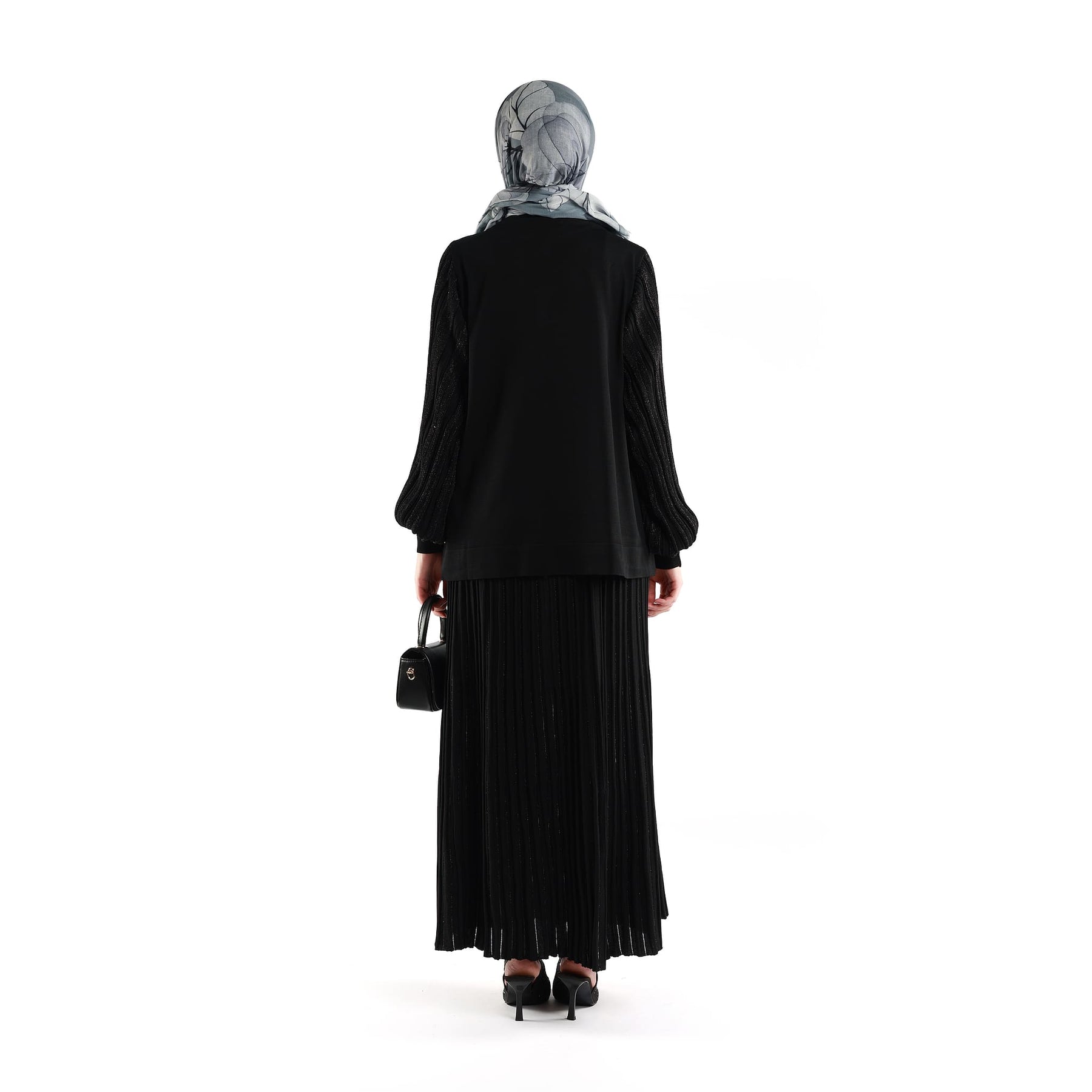 The glitter ribbed pattern tunic set stands out with its elegant and refined design, perfect for special events and occasions. The stand collar features subtle glitter detailing, adding a touch of sparkle, while the ribbed texture on the sleeves and hemline contrasts beautifully with the smooth upper fabric for a balanced look.