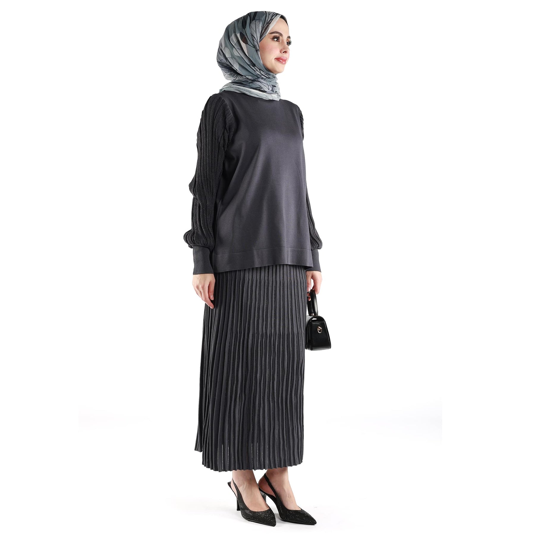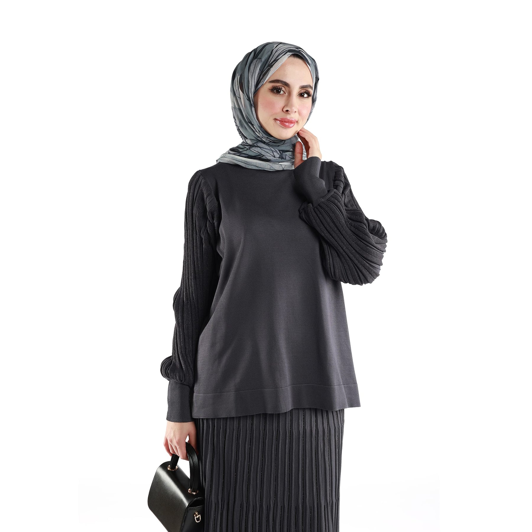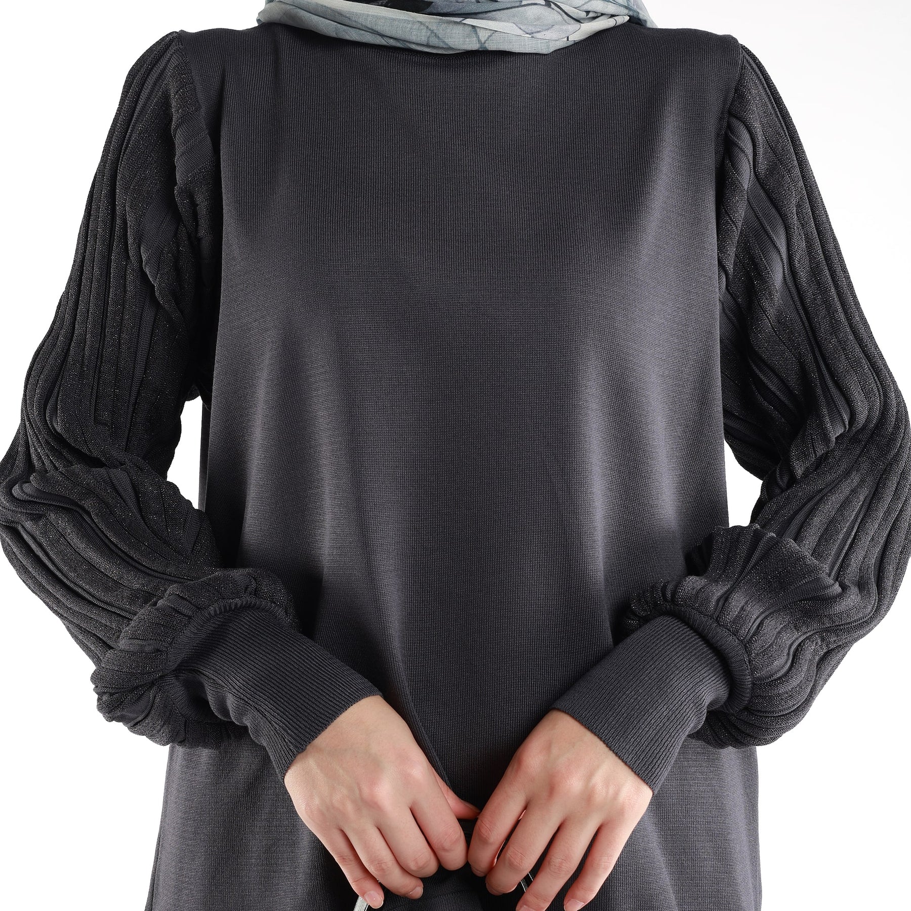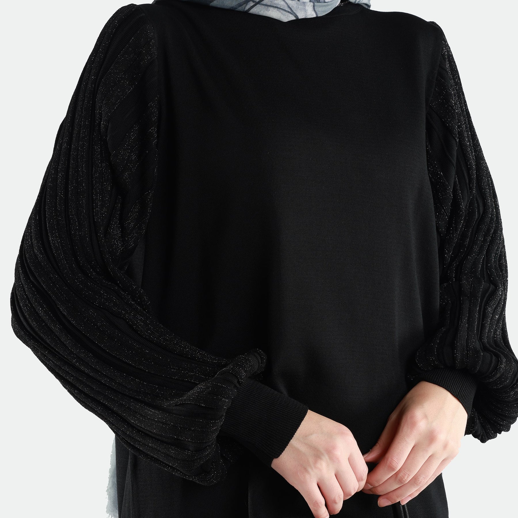 The glitter ribbed pattern tunic set stands out with its elegant and refined design, perfect for special events and occasions. The stand collar features subtle glitter detailing, adding a touch of sparkle, while the ribbed texture on the sleeves and hemline contrasts beautifully with the smooth upper fabric for a balanced look.