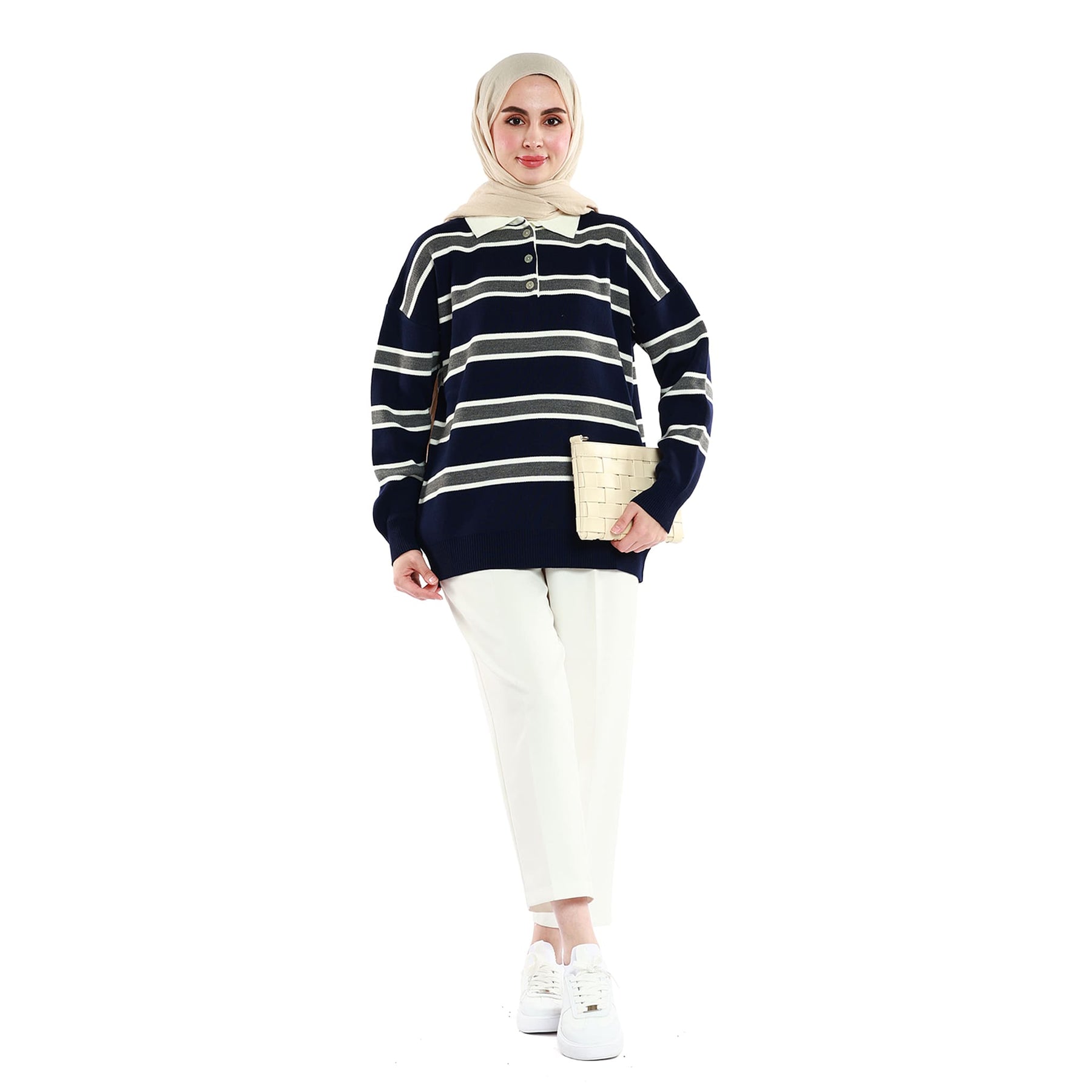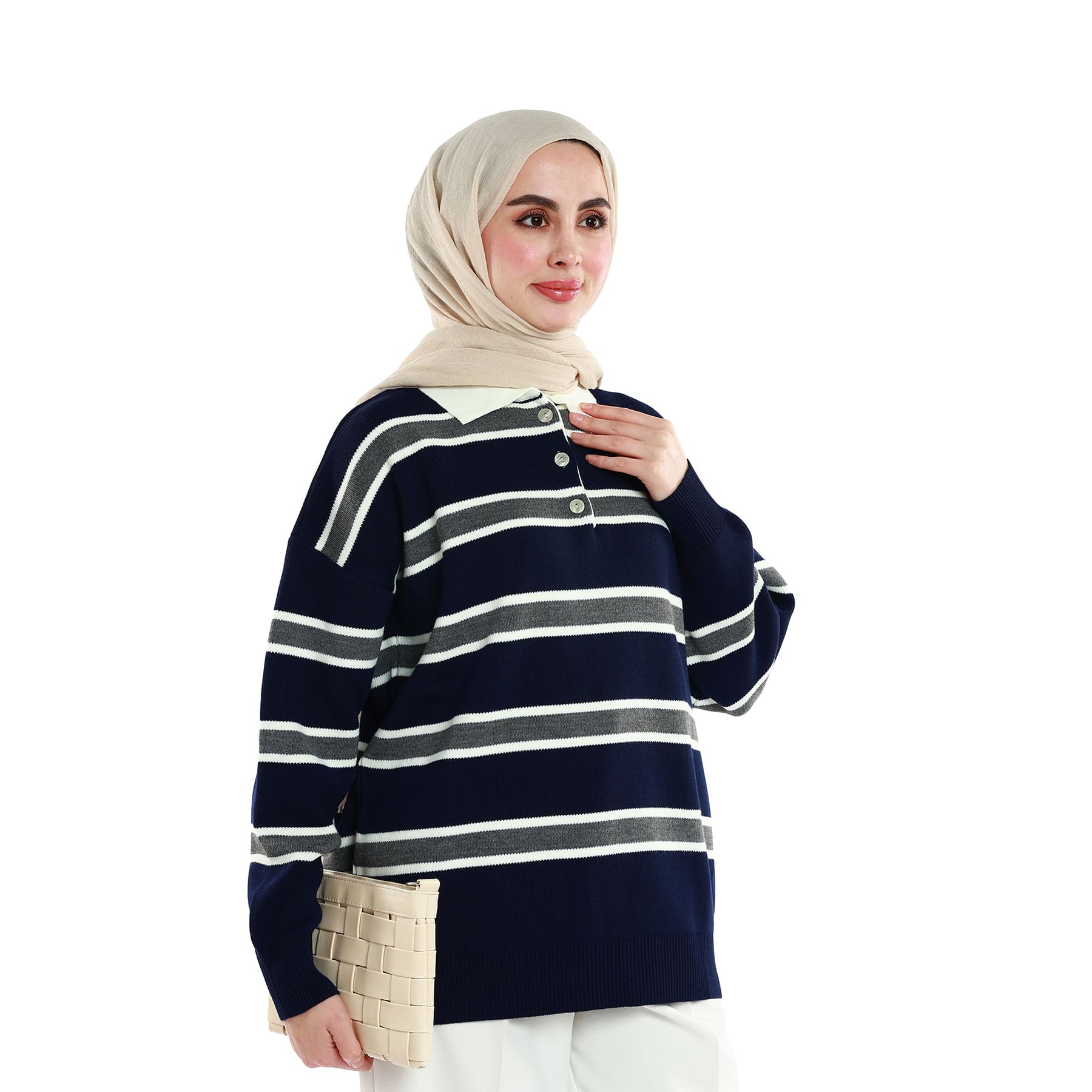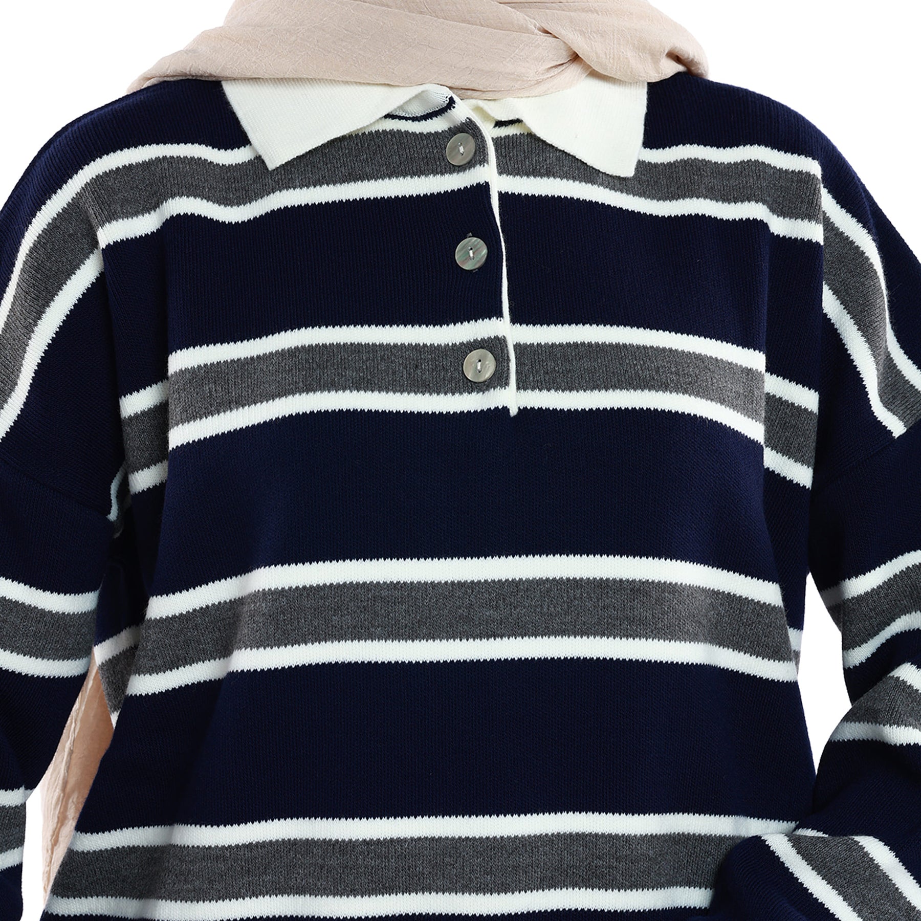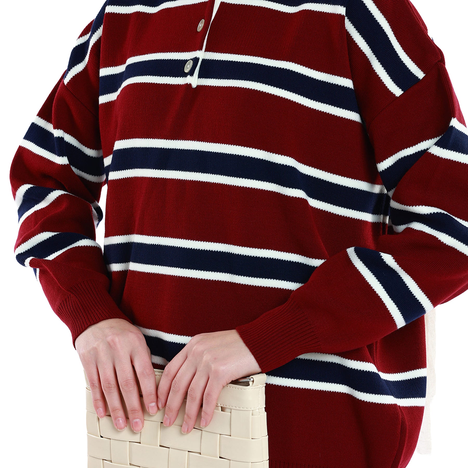 This striped polo neck sweater stands out with its modern and stylish stripe pattern, offering both comfort and sophistication. The three-button detail at the neckline adds practicality while enhancing the elegant design. Made from a 30% cotton and 70% acrylic blend, it provides a soft texture and long-lasting comfort.