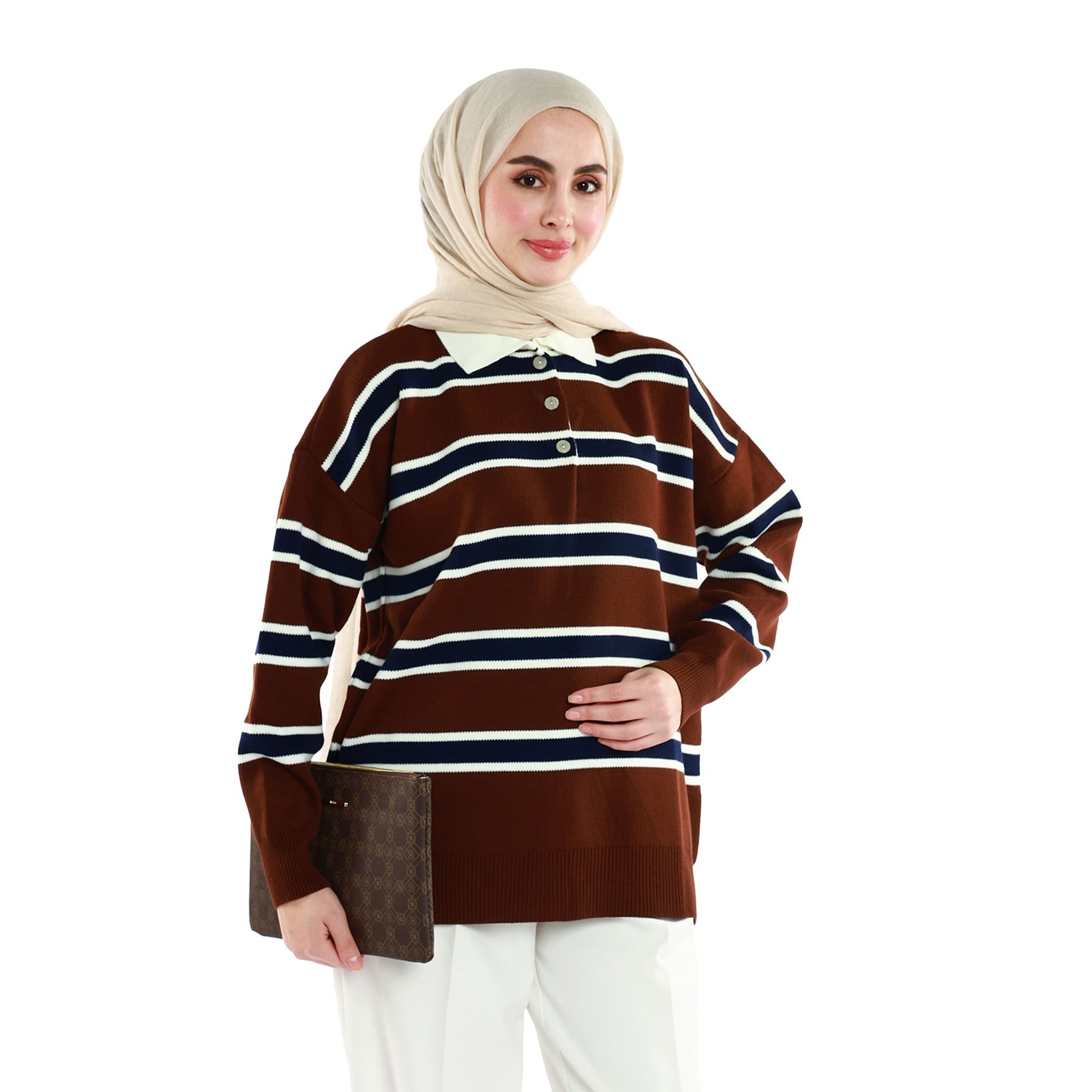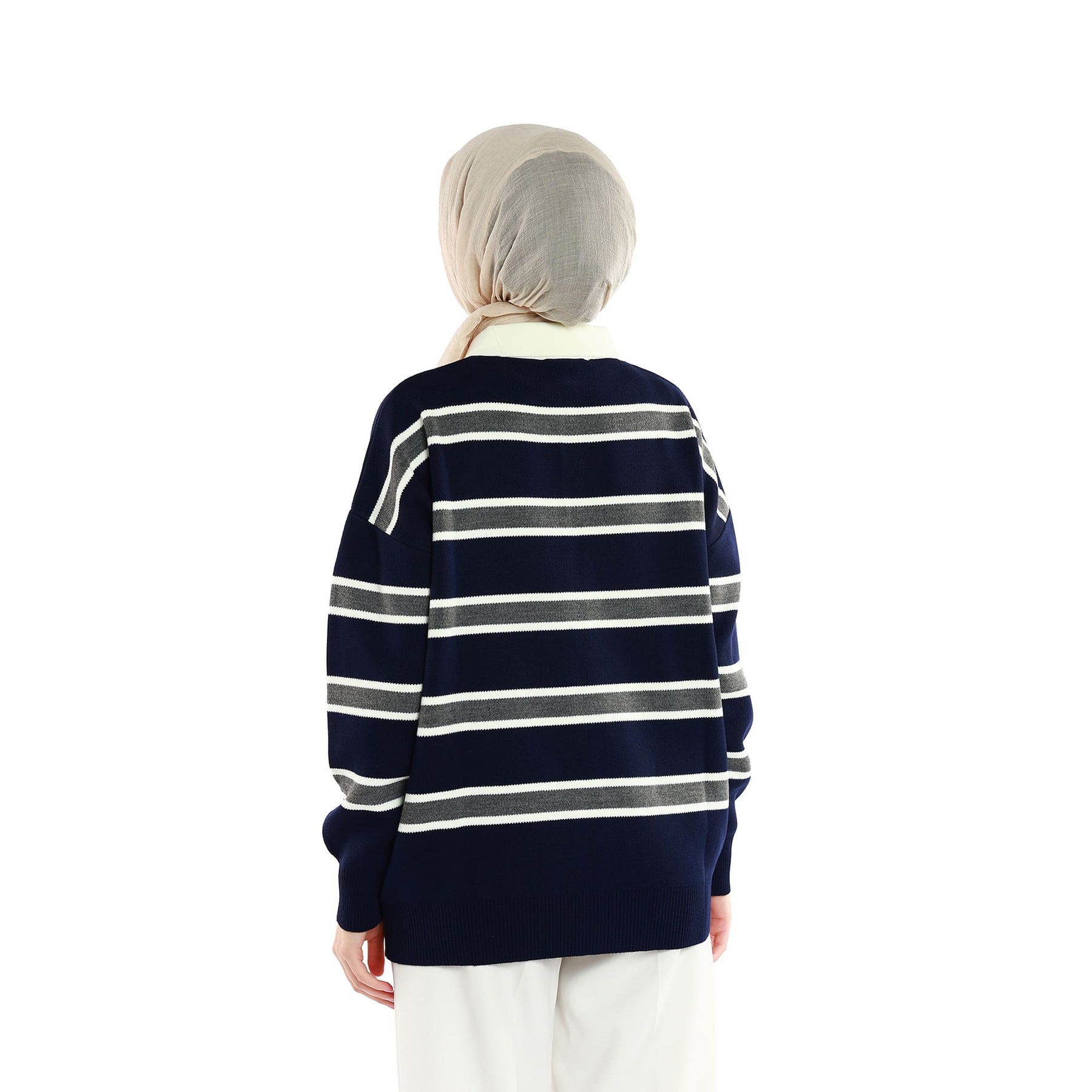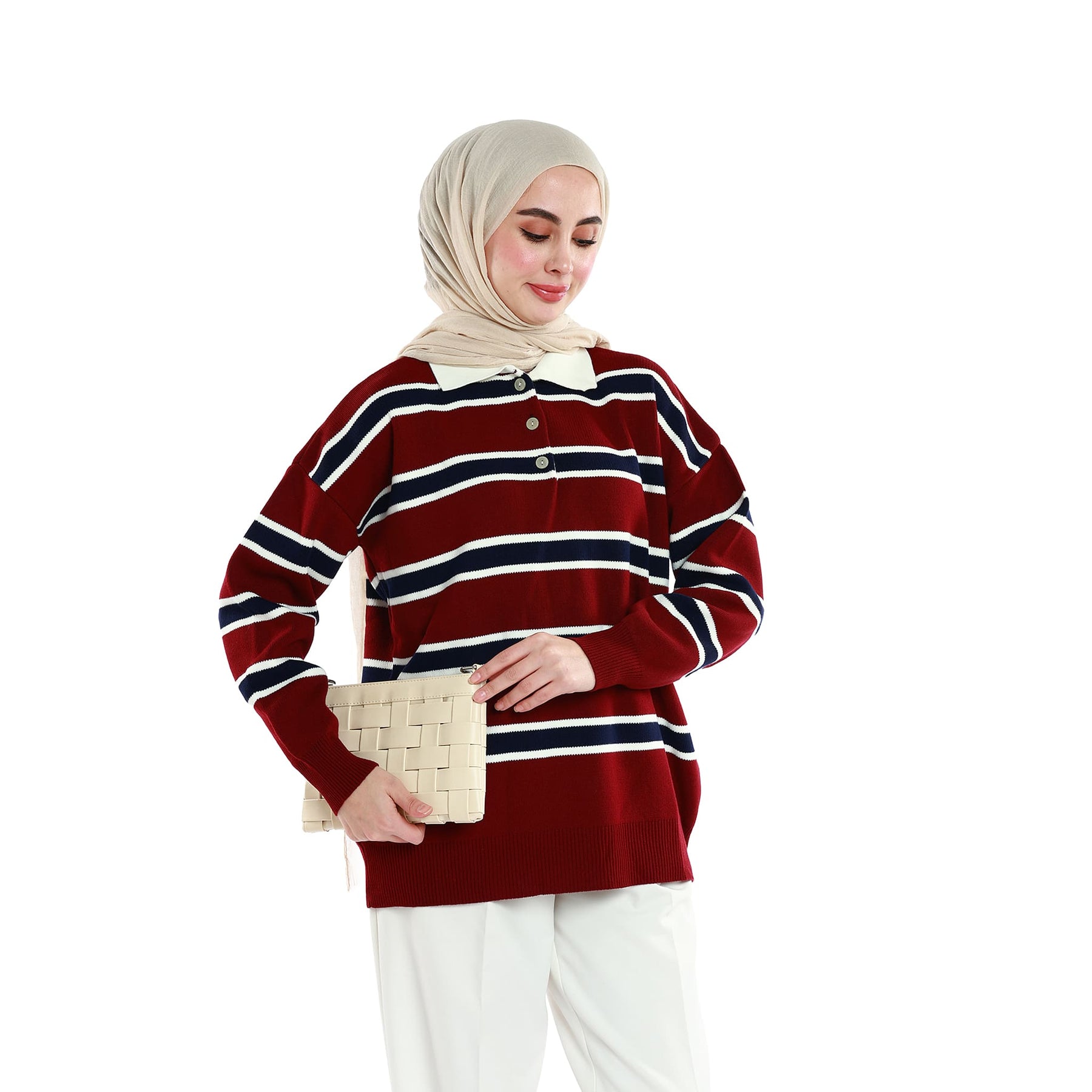 This striped polo neck sweater stands out with its modern and stylish stripe pattern, offering both comfort and sophistication. The three-button detail at the neckline adds practicality while enhancing the elegant design. Made from a 30% cotton and 70% acrylic blend, it provides a soft texture and long-lasting comfort.
