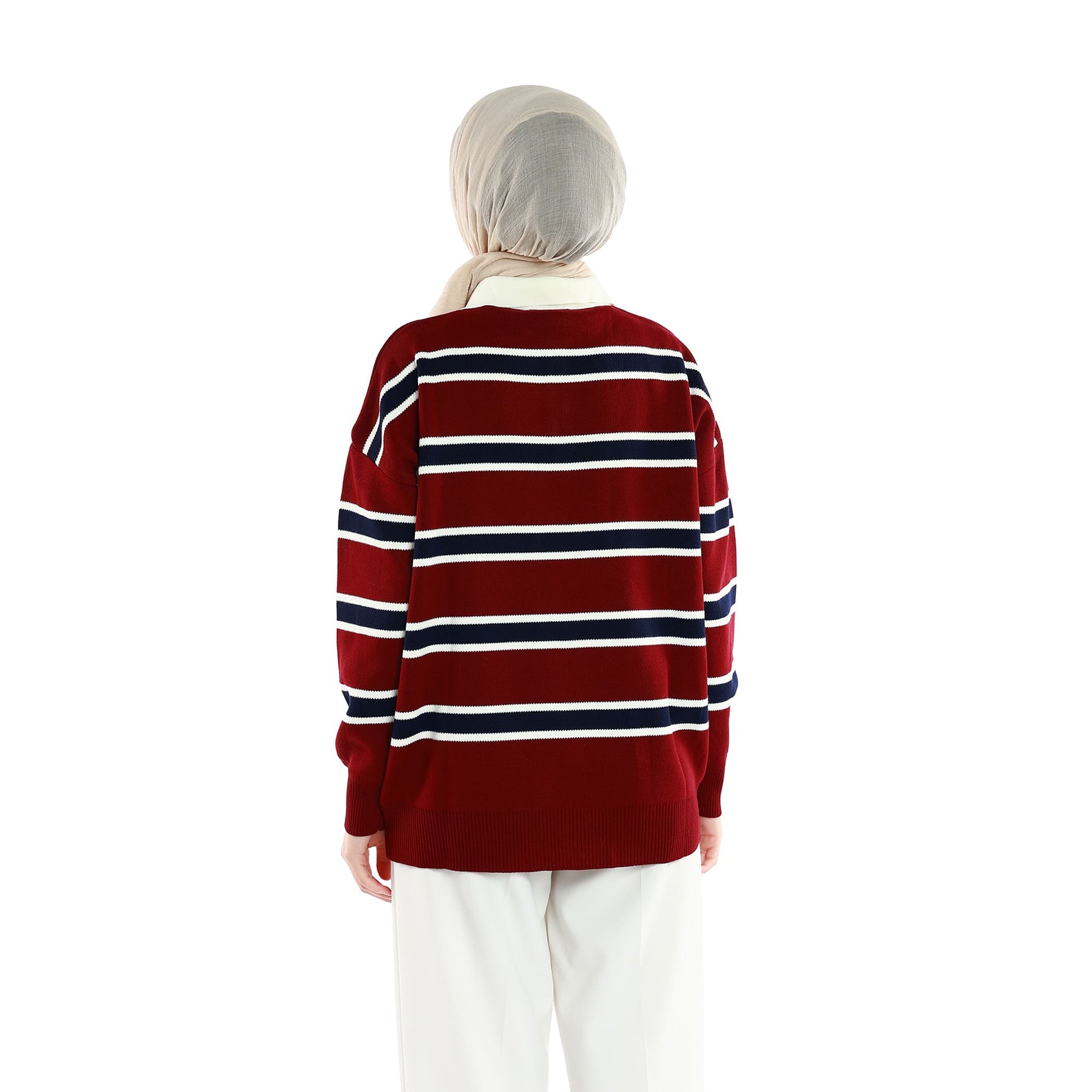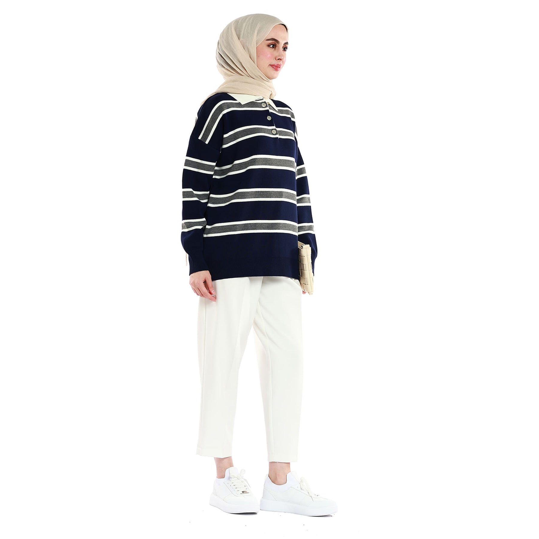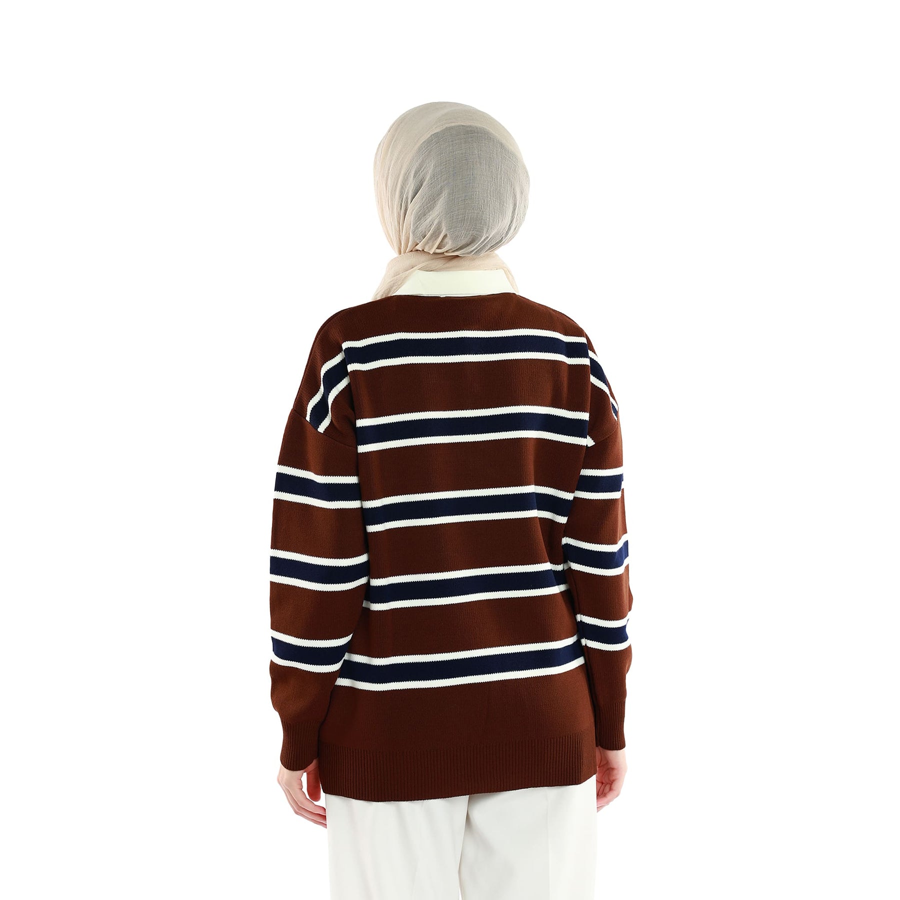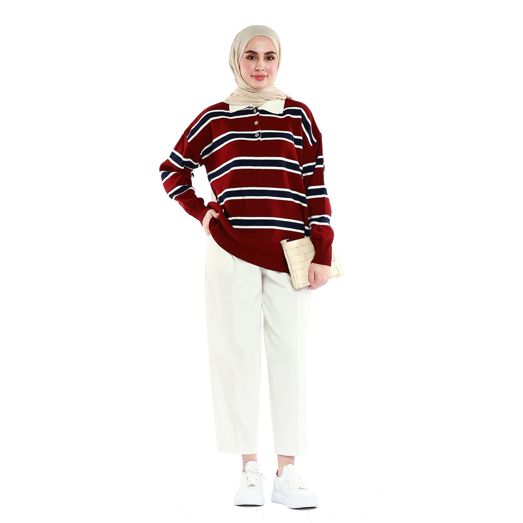 This striped polo neck sweater stands out with its modern and stylish stripe pattern, offering both comfort and sophistication. The three-button detail at the neckline adds practicality while enhancing the elegant design. Made from a 30% cotton and 70% acrylic blend, it provides a soft texture and long-lasting comfort.